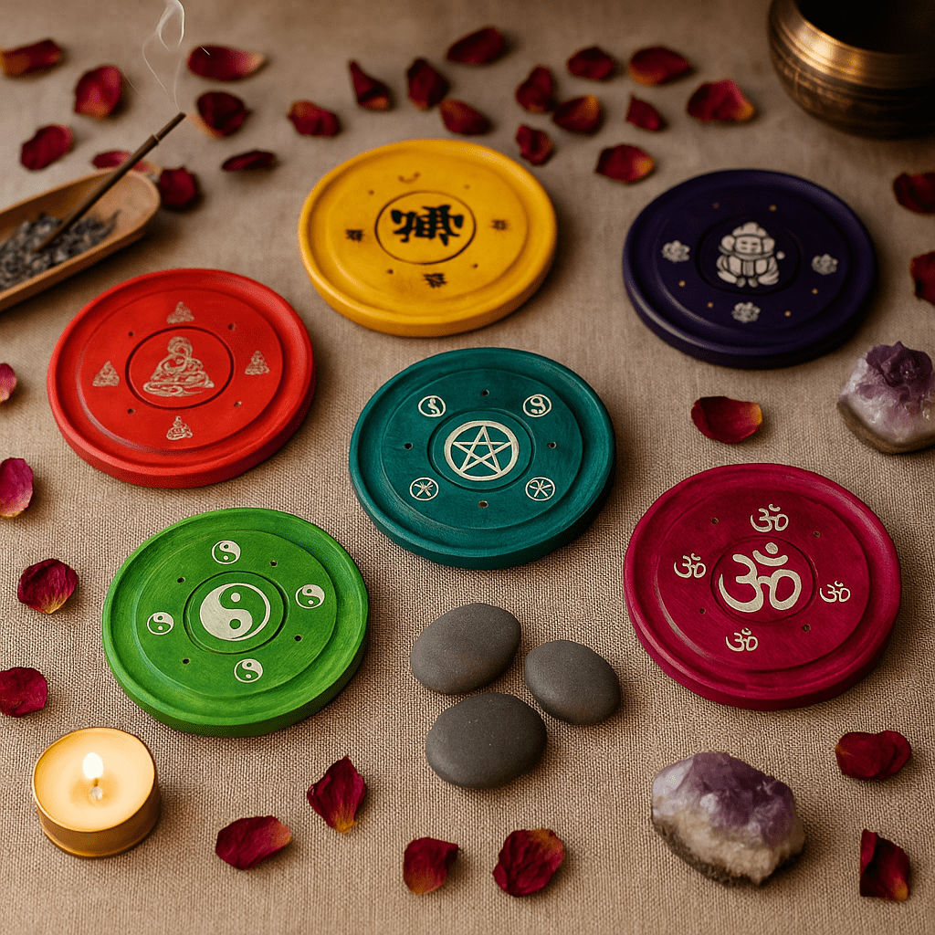Shaped as a flat wooden disc with a gently recessed center, it features concentric rings that guide falling ash. The colored surface—deep red, golden yellow, dark blue, green, teal, or magenta—lets the natural grain softly show through, while crisp white motifs and small surrounding icons add quiet character. A drilled holder point secures a standard incense stick; ash gathers neatly on the plate, keeping your surface clean. Motifs include Om (a sacred sound associated with unity), Ganesha (honored as a symbol of wisdom and new beginnings), yin–yang (balance of complementary forces), a pentagram within a circle (often read as the five elements and protection), and a serene meditative figure (a gentle reminder of presence and compassion). Some designs also feature calligraphic script inspired by classical South Asian lettering.
