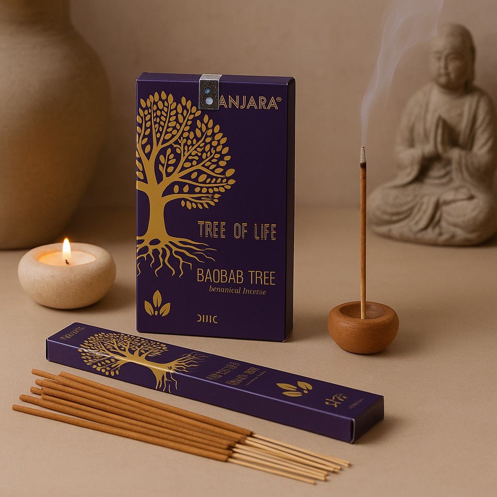 Handcrafted in India with natural botanicals, this incense nods to long-practiced incense-making traditions. The Tree of Life, shown here in a refined motif, is widely associated with unity, growth, and our connection to all living things. The Baobab—revered across parts of Africa for its life-sustaining trunk and long presence—often symbolizes endurance and wisdom; many keep such symbols in living or reflective spaces as quiet reminders of resilience. A deep purple box with a gold tree accent gently echoes that meaning without excess.