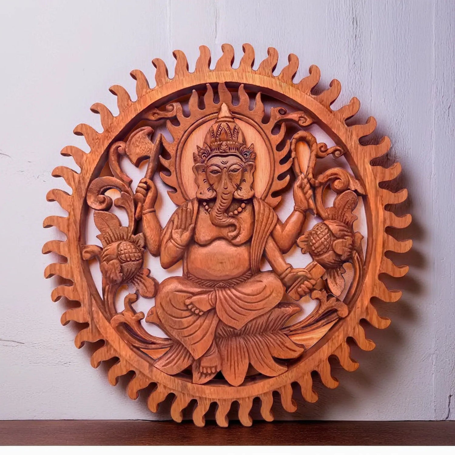 Warm suar wood, hand-carved in Indonesia, becomes a 40 cm relief whose smooth grain and gentle sheen catch the light. At its heart sits Ganesha within a radiant border — a piece of art that brings quiet meaning, harmony, and spiritual resonance to the wall.