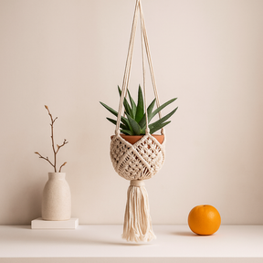 Soft, off-white cords gather into a gentle cradle, lifting your plant into the light. The handwoven openwork brings airy texture to a wall or window, adding height and a quiet softness that lets greenery take center stage. 🌿