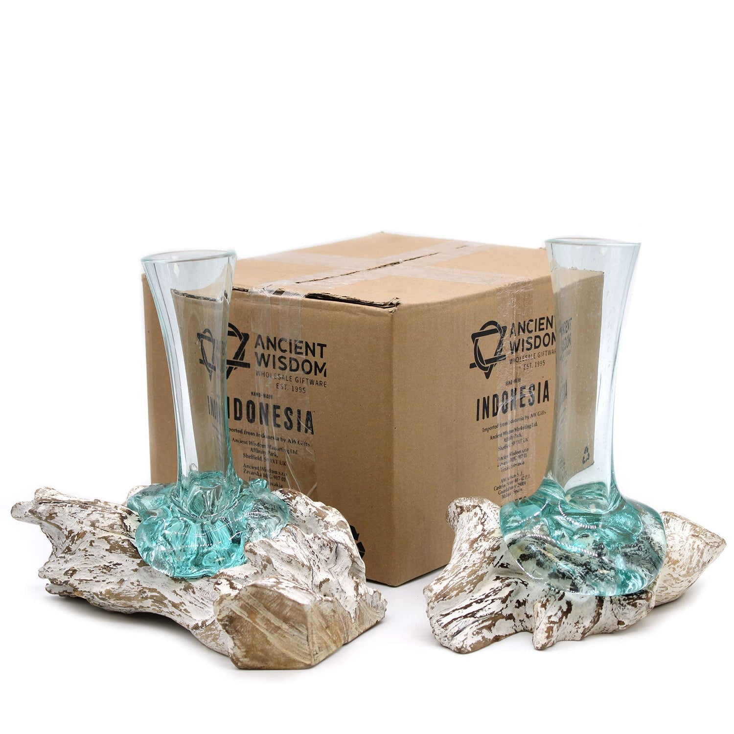 Cool, transparent glass with a light seafoam tint settles into warm Balinese gamal wood, like water finding its shore. The whitewashed base lets soft tan and brown grain peek through; the vessel rises tall and clear, finishing in a gentle, flared rim. 🌊🪵