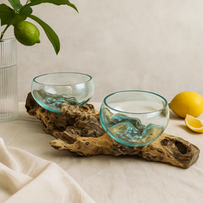 The glass rests like a pool of clear water, its soft blue-green tint catching the light, while the Balinese Gamal wood base holds it in a natural embrace. Hand-shaped and gently settled over the wood while warm, the vessel takes the root’s contours as its own — a quiet meeting of nature and design. 🌿🌊