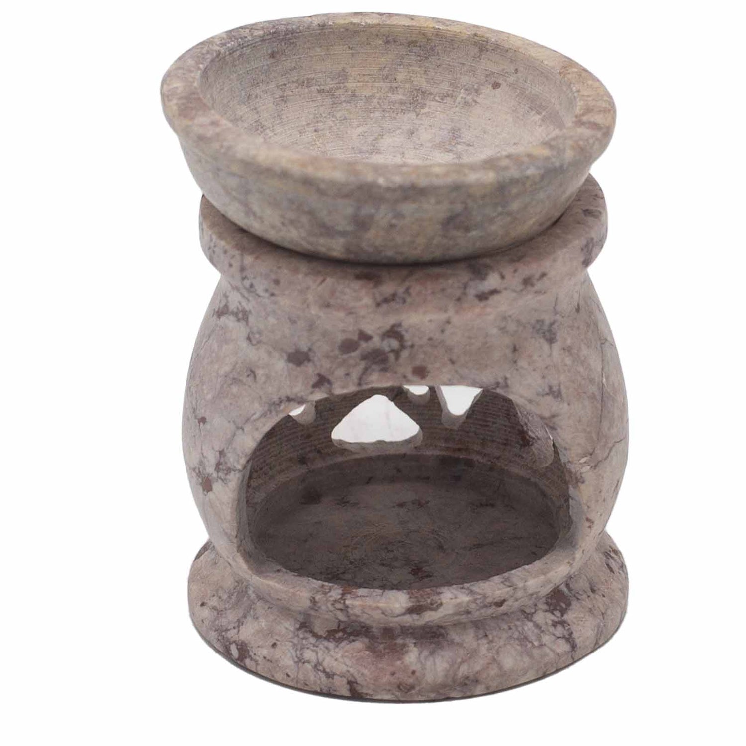 Cool, matte soapstone rests softly in the hand, its beige-grey surface traced with purple-brown veining. Light a candle within and the carved openings cast gentle constellations across the room, letting warmth, scent, and glow gather into a quiet ritual. 🕯️🌙