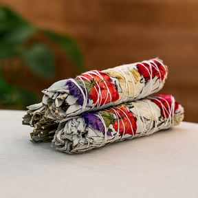 🌿 Pale gray-green sage leaves, hand-tied with white twine and banded with red, yellow, and purple petals, carry an ancient practice of purification into the home. In many Indigenous traditions of North America, white sage (Salvia apiana) is burned in ceremony as an offering and a reminder of respect, clarity, and mindfulness. The added rose, carnation, and daisy petals lend gentle color and a soft floral accent.