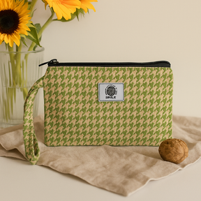 The exterior is a tightly woven fabric with a soft hand and quiet structure. Subtle, earth-toned palettes and fine geometric weaves—tiny checks and houndstooth-like motifs—lend texture without fuss. A smooth top zipper keeps contents secure, while the flexible build makes it easy to pack. Room for coins and cards, keys, lip balm and a compact, jewelry, a small cable and earbuds, or a few travel minis. Use it as a wristlet, or tuck it inside a larger bag as a tidy organizer.