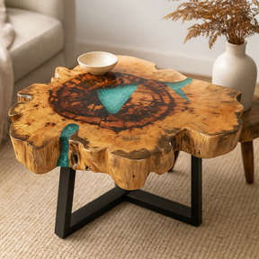 Warm grain meets cool gloss. A thick tamarind slab holds the quiet of the forest in its rings, while tranquil aqua resin settles into the wood’s natural contours. Set down a mug, open a book, and let the table anchor the room in an easy, everyday rhythm. ☕🌊