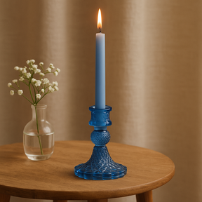 Poured from a high-quality, slow-burning wax blend with a natural cotton wick, it offers an even, reliable glow and a clean, steady burn. Approximately 50–60 hours of burn time (with proper wick care) support unhurried nights and meaningful moments. As a centerpiece, it settles beautifully into your space—on a mantel, dining table, or meditation corner—bringing warmth and gentle presence. Set it on your favorite holder; pressed glass in deep royal blue, with crisp faceted patterns, softly catches and deepens the light for an elegant, vintage touch. ✨