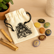 - 🧵 Saco de cordão em tela: Bege claro com arte meditativa preta e cordões duplos para fácil transporte.