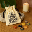 Pedras lisas e arredondadas aninham-se numa bolsa leve de tecido com cordões pretos e um motivo meditativo tranquilo. Esta coleção de sete peças honra a tradição das cores dos chakras — uma bela companhia para meditação, decoração ou simples rituais diários. 🌈
