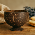 - 🪵 Natural materials: Coconut shell bowl with a low wooden stand for stability.
