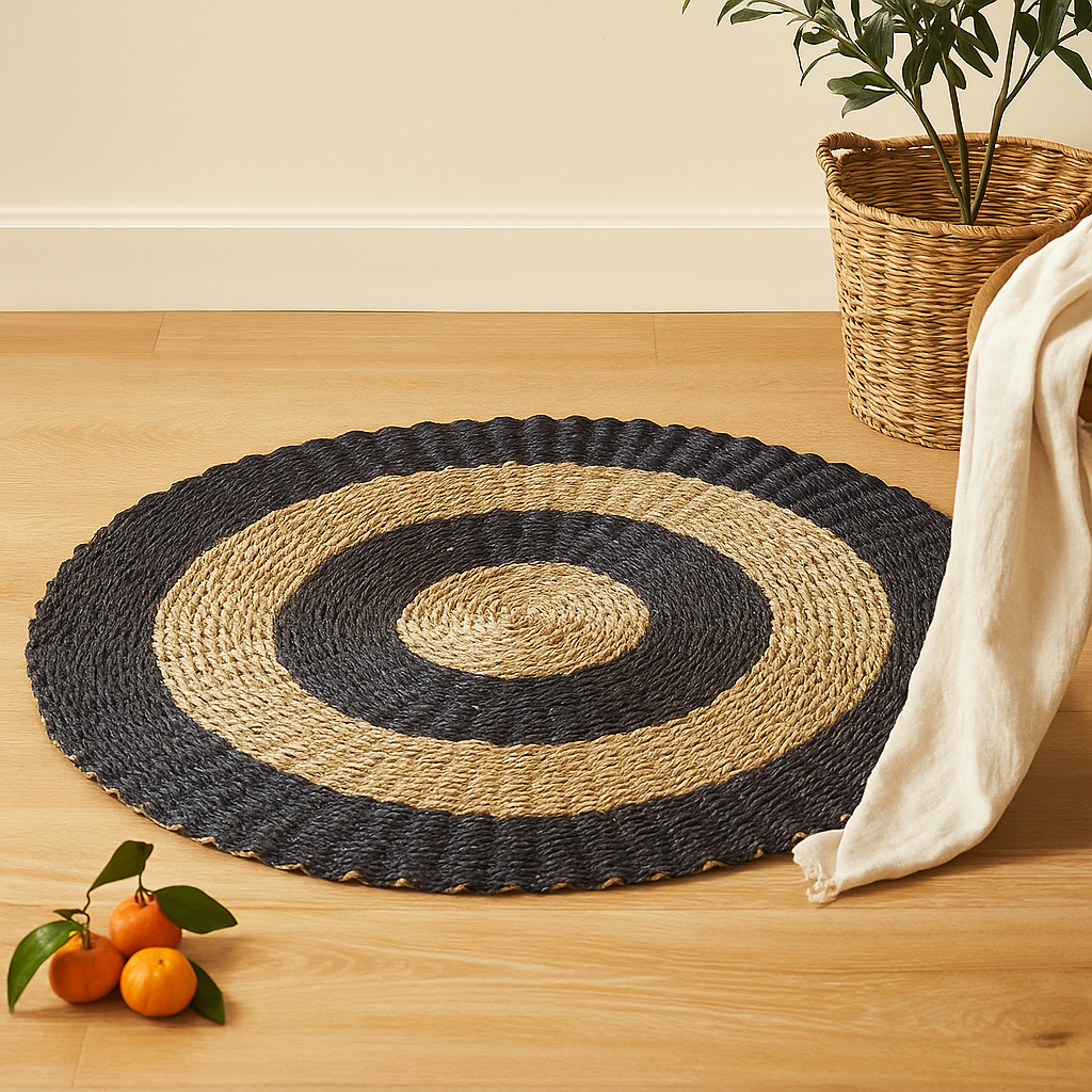 Tapete de erva-do-mar redondo preto e castanho com círculos 1m