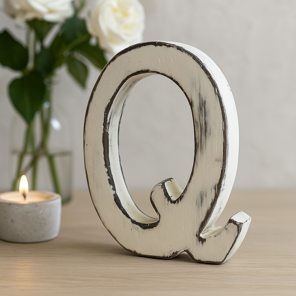 Branco suave com desgaste gentil e esfregado à mão, esta Q maiúscula independente traz carácter silencioso, intenção e calor a qualquer divisão. As bordas desgastadas revelam toques de madeira por baixo, equilibrando a clareza de um símbolo com a calma do material natural. ✨