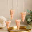 A pedra do sol fresca e suave repousa entre os seus dedos, os seus tons pêssego e rosa salpicados com inclusões pálidas. Um cone afilado com uma ponta fina e coroa plana pendura-se numa corrente fina de tom prateado, assentando num arco calmo e uniforme. Simples, equilibrado e discretamente enraizador. 🔶🌞