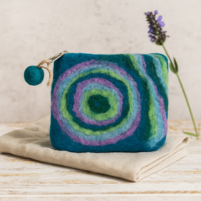 Feito à mão no Nepal com um exterior em tecido feltrado à mão, tem uma textura suave e felpuda e cantos arredondados para conforto no bolso. Um fecho de correr superior liso fecha-se com segurança, terminado com uma pequena bola de feltro para uma pega rápida. A frente mostra um redemoinho concêntrico em tons de teal, azul, verde, verde claro e roxo, enquanto o lado continua com bandas fluidas que ecoam a mesma paleta. 🌈