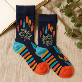 Tecidos numa mistura rica em bambu (70% bambu, 28,5% poliamida, 1,5% elastano), são suaves na pele, respiráveis e que afastam a humidade, mantendo os pés quentes sem peso. Uma costura lisa na ponta reduz o atrito, enquanto a bainha mantém-se confortavelmente no lugar. Notas de cor — uma ponta laranja contrastante, acentos em azul-petróleo e âmbar, e riscas subtis — trazem personalidade fácil para o descanso em casa ou para sapatos do dia a dia. O trabalho de linhas finas remete para formas de apanhadores de sonhos da tradição Ojibwe, amplamente partilhados hoje como símbolos de cuidado e proteção suave, e para a geometria mandala frequentemente associada ao equilíbrio e à totalidade. Disponível em dois tamanhos: EU 36–40 (UK 3.5–6.5) e EU 41–46 (UK 7.5–11.5). 🌙