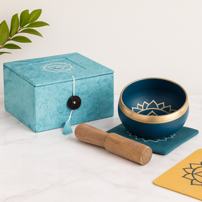 Como usar: segure a taça na palma aberta ou descanse-a na pequena almofada azul-petróleo; bata levemente na borda para uma nota clara, ou circule a borda com pressão uniforme para uma vibração sustentada. Comece uma meditação, defina o tom antes de dormir, ou refresque a energia de uma divisão entre atividades. 🧘