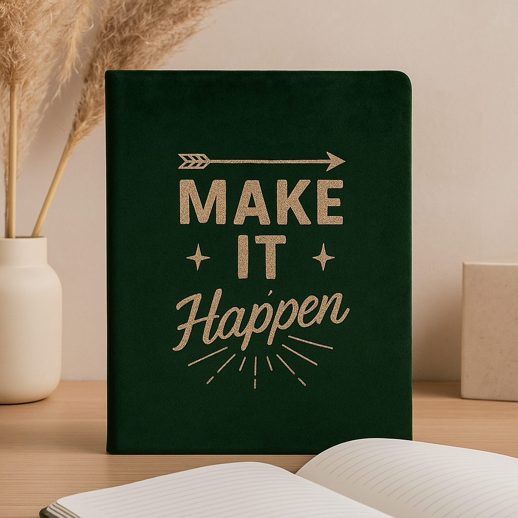 Um caderno tamanho A5 com 80 páginas, revestido por uma capa de veludo verde escuro e com as palavras "Faz Acontecer" na frente. O veludo é liso, não felpudo — tem a textura refinada e de pelo curto típica de estofos ou alfaiataria, em vez da suavidade fofa de uma almofada. O verde escuro transmite seriedade e estabilidade: uma cor associada à concentração, ambição e confiança tranquila. Combinado com a frase "Faz Acontecer" na capa, este caderno tem uma personalidade decididamente orientada para a ação — é para anotar planos e depois executá-los.