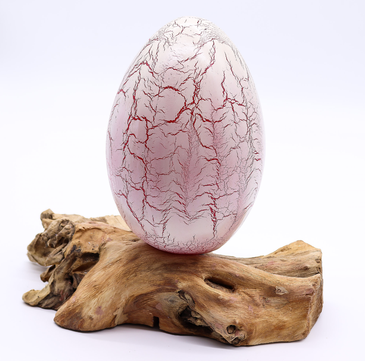 Uma lâmpada de mesa artesanal em madeira flutuante com um abat-jour em forma de ovo de fibra de vidro laranja, acabado com um padrão craquelado — quando acesa, o brilho âmbar quente que passa pelas fissuras parece fogo visto através de terra rachada.