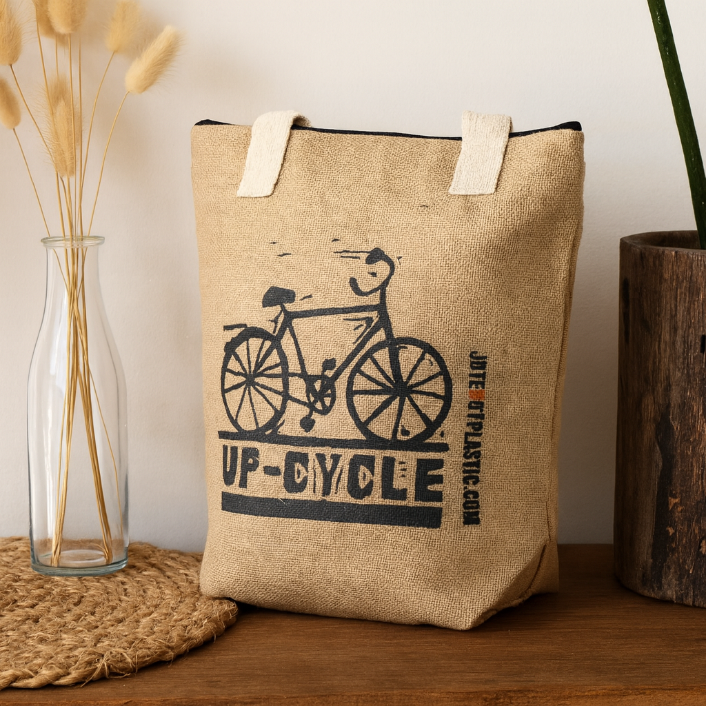 Țesut din iută aspră, de culoare tan, cu o textură vizibilă de țesătură simplă, se simte solid și de încredere. Mânerele duble din iută stau confortabil în mână sau pe braț. Un fermoar negru neted asigură partea de sus, în timp ce cusăturile îngrijite și întărite urmează cusăturile pentru rezistență zilnică. Imprimarea frontală — o bicicletă și cuvântul „UP-CYCLE” — oferă un omagiu discret reutilizării conștiente fără a striga. 🚲