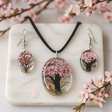 O cupolă clară, lucioasă prinde lumina; în interior, un Arbore al Vieții înflorește în roz pal peste verde proaspăt. Acest set asortat de colier cu pandantiv și cercei pendanți este un ansamblu echilibrat—rafinat pentru momente speciale, discret natural pentru purtarea zilnică. 🌸