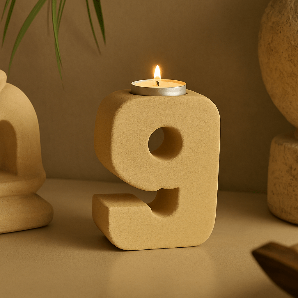 Lumina blândă întâlnește piatra. Pe măsură ce o lumânare tealight pâlpâie, gresia palidă și mată difuzează o strălucire calmă în jurul curbei curate a unui număr sculptural 9, aducând căldură și un caracter liniștit oricărui colț. 🕯️