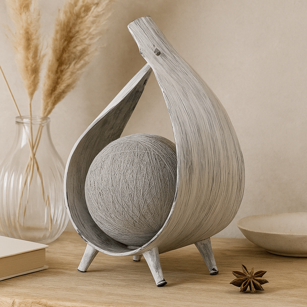 Modelat manual dintr-o frunză reală de nucă de cocos și format termic într-un leagăn în formă de lacrimă, finisajul său gri spălat arată tușe subtile de pensulă și un ton costier uzat. Marginile se întâlnesc în partea de sus, fixate cu grijă cu un mic element rotund de prindere. În interior, o sferă din bumbac difuzează lumina într-un halou cald cu umbre delicate încrucișate. Are o dimensiune confortabilă pentru o masă laterală, raft sau noptieră, iar curba organică a frunzei înseamnă că fiecare piesă are propriul său caracter. Asociază-l cu un LED alb cald pentru cea mai liniștitoare strălucire. ✨