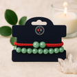 Alege culoarea șnurului—negru, maro sau roșu—pentru brățara împletită. Pentru a solicita o culoare specifică, adaug-o în instrucțiunile speciale la finalizarea comenzii; dacă nu este menționată nicio culoare, vom selecta cu grijă pentru tine. Duo-ul vine pe o cartelă de prezentare bleumarin închis cu accente geometrice multicolore, imprimată cu „Gemstone Double Power Bracelets,” „Prosperitate și Echilibru,” și „Jad.” 🪢