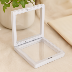 Un pătrat subțire în alb calm, 11 × 11 cm. Margini netede, prezență liniștită. Introdu o fotografie, monedă, frunză sau bijuterie între straturile transparente și pare că plutește—ușor, suspendat, frumos de simplu. 🕊️