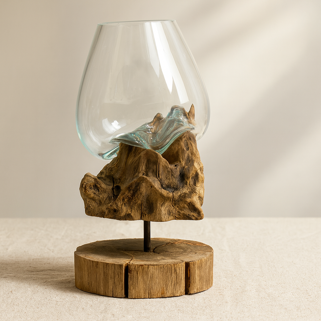 Sticla rece și transparentă întâlnește lemnul cald Gamal într-o armonie liniștită a formei naturale și designului artizanal. Realizat manual în Bali din sticlă reciclată, bolul este modelat în stare topită și așezat pe lemn astfel încât să se așeze în fiecare contur, găsind o potrivire organică și exactă. Meșteșugul balinez onorează vocea materialului—ghidat cu grijă, nu forțat—astfel încât fiecare piesă se simte ancorată și delicat rafinată. 🌿