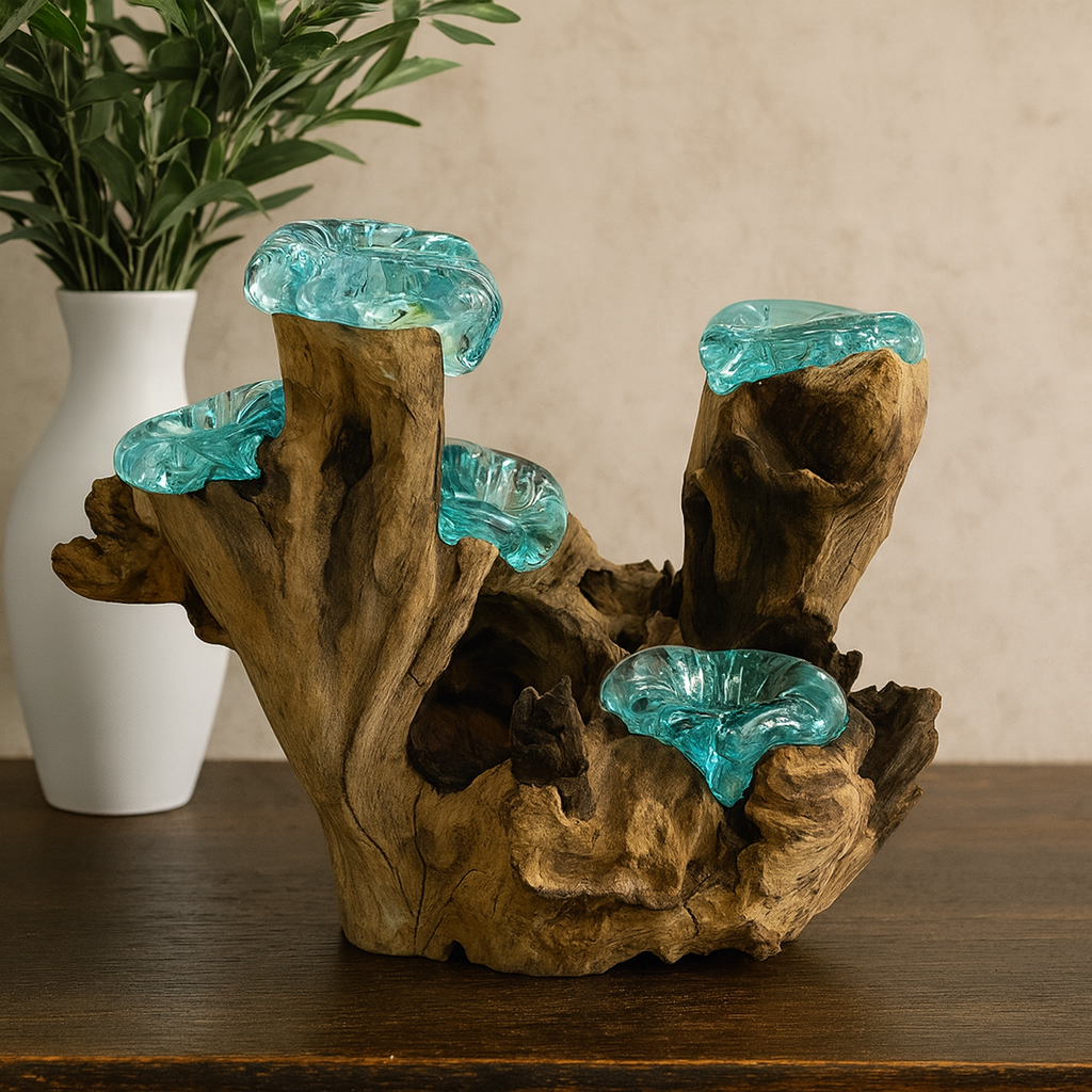 Confecționat manual în Indonezia, sticla reciclată este modelată prin foc pentru a se cuibări într-o bază solidă din lemn de gamal. Silueta pare organică — contururi asemănătoare rădăcinilor cu goluri și denivelări naturale. Lemnul este mat și plăcut la atingere, cu o textură bogată și o profunzime pământoasă; sticla este netedă și lucioasă, cu valuri moi și bule mici care prind lumina. Variațiile subtile și micile imperfecțiuni fac parte din caracterul său, făcând fiecare piesă în mod discret unică. 🌿