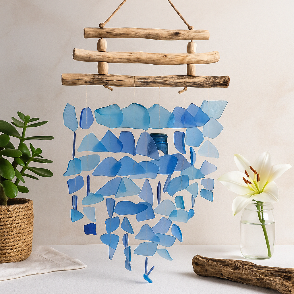 Realizat manual în Indonezia din sticlă reciclată și lemn plutitor natural, fiecare piesă plată, asemănătoare sticlei de mare, este netezită, translucidă și suspendată pe un filament fin în rânduri conice care creează o siluetă elegantă și alungită. În multe tradiții, clopoțeii de vânt sunt primiți ca gardieni prietenoși ai pragului — se crede că invită norocul, alungă negativitatea și aduc claritate zilei. Aici, tonul este moale și luminos, un clinchet delicat care se așază ușor în aer, liniștitor într-un living, lângă o fereastră, pe un balcon sau într-un colț de meditație. Ascultatul devine o practică simplă: respirația încetinește, atenția se adună, iar spațiul se simte îngrijit cu blândețe. 🌿