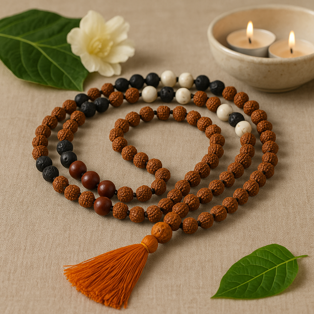 - 🌿 Sămânțe Rudraksha: Material tradițional legat de Shiva, cu caneluri tactile care susțin numărătoarea.