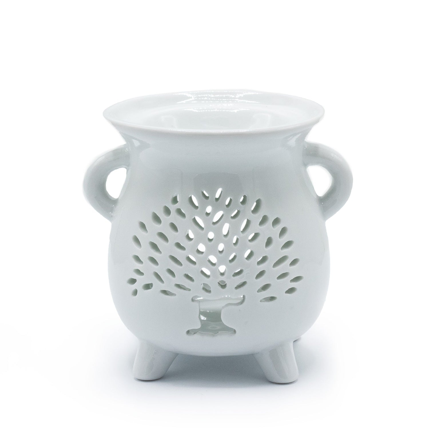 Lumina blândă a lumânării se adună într-o formă lucioasă, solidă, albă de cazan, iar parfumul ales de tine se ridică încet în încăpere. Copacul Vieții perforat din față strălucește ca o dantelă fină, proiectând umbre delicate de frunze în timp ce căldura și parfumul transformă un colț al casei într-un ritual liniștit. 🕯️