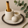 Designed as a simple, modern set: two off-white cylindrical holders for tealights, incense cones, or small tools; and a small matte sphere with a single top hole for a stick such as incense or Palo Santo. The glazed tray keeps everything gathered; the rim helps catch ash and makes cleanup easy. 🌿