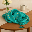 Un înfășurător ușor, semi-transparent turcoaz se desfășoară cu o cădere moale; peștii metalici aurii strălucesc ușor pe măsură ce țesătura se mișcă. Neted la atingere, tivit cu grijă și finisat cu ciucuri înfășurați în fire fine de aur, poartă o lejeritate aerisită care se simte bine pe piele. 🌊