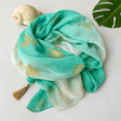 Rece la atingere și ușor în mână, acest sarong cade într-o țesătură aerisită, semi-transparentă. Un ombré delicat de la aqua marin la alb atrage privirea, în timp ce motivele metalice fine cu țestoase strălucesc ușor când te miști; un ciucure mic auriu într-un colț adaugă o notă discretă. 🌊