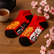 Țesătura bogată în bambus se simte mătăsoasă și delicată pe piele, cu o respirabilitate care menține picioarele îngrijite — calde când te odihnești, confortabile când ești în mișcare. Tricotajul roșu este accentuat de vârful, călcâiul și manșeta negre, cu detalii galbene îndrăznețe și o față veselă de pisică deasupra. În cultura japoneză, Pisica Norocoasă (Maneki‑neko) este un simbol primitor al norocului, adesea plasat la intrări; aici, este o amintire prietenoasă a bunătății și pozitivismului pe care le poți purta.