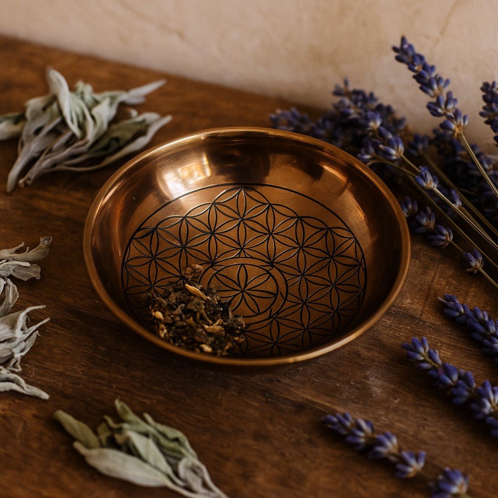 Strălucirea cuprului adună lumina și stabilizează mintea. Acest bol ritualic rotund și puțin adânc oferă un punct focal calm, marginea sa netedă și părțile curbate ghidând privirea spre o geometrie liniștită. În interior, o suprafață lustruită reflectă flacăra și cenușa, în timp ce Floarea Vieții gravată se odihnește în centru ca o busolă blândă. 🔶