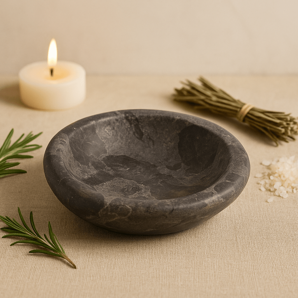 Așază-l pe altarul tău pentru a susține ceea ce are semnificație pentru tine. O mică piscină de apă pentru a reflecta asupra intenției. Petale, boabe sau sare pentru recunoștință și împământare. Un praf de ierburi, o lumânare tealight sau un con de tămâie așezat pe un pat de nisip pentru a proteja piatra. Suprafața sa mată până la semi-mată și marginea rotunjită, unduitoare, oferă o senzație calmă la atingere și stabilitate sub mână, invitând la un ritual lent și deliberat.