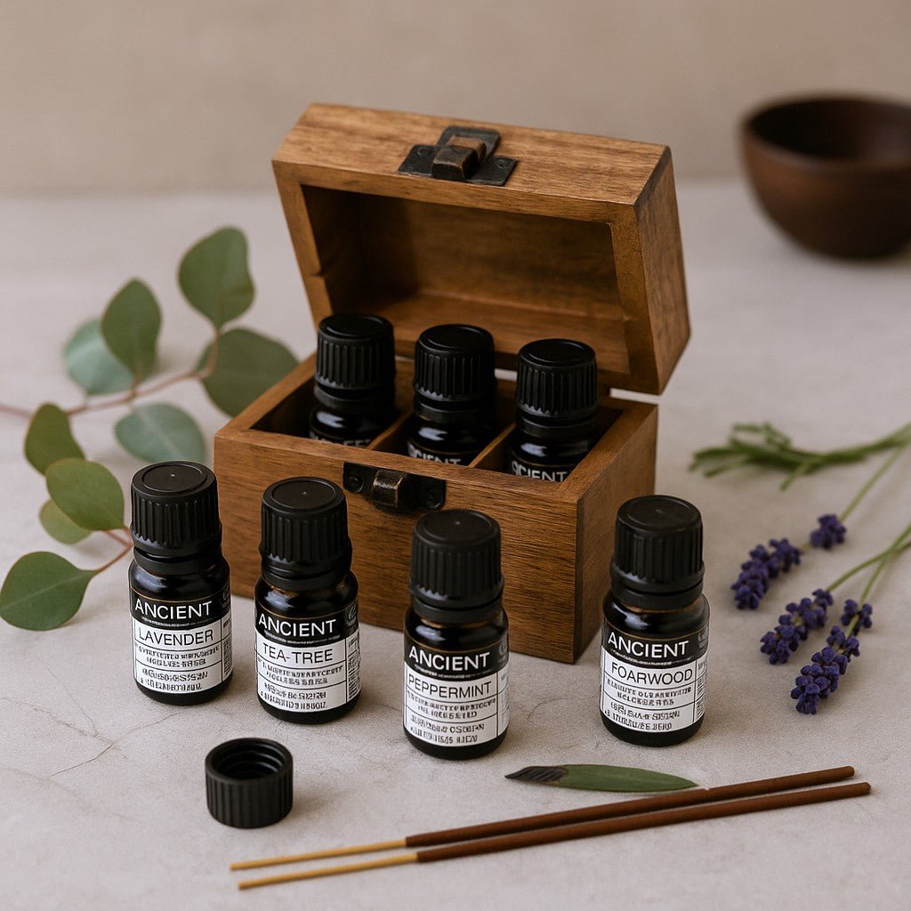 🌿 Ridică capacul neted din lemn de mango și vei găsi șase sticle chihlimbar ținute ordonat la locul lor. Încuietoarea cu ton antic face un clic moale, iar un spectru liniștit de botanice se ridică — răcoritor, luminos, floral și cald lemnos — o călătorie blândă prin parfum, curată pentru echilibru și ușurință zilnică.