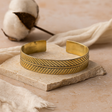 Banda păstrează o lățime uniformă cu capete plate, pătrate și o deschidere în spate pentru o potrivire ușoară și confortabilă. O gravură centrală în model herringbone este precisă, încadrată de două linii paralele fine. Suprafața este netedă la atingere, cu o patină blândă care adaugă căldură, iar o marcă discretă „CRAFTED” se află în interior. 🌿