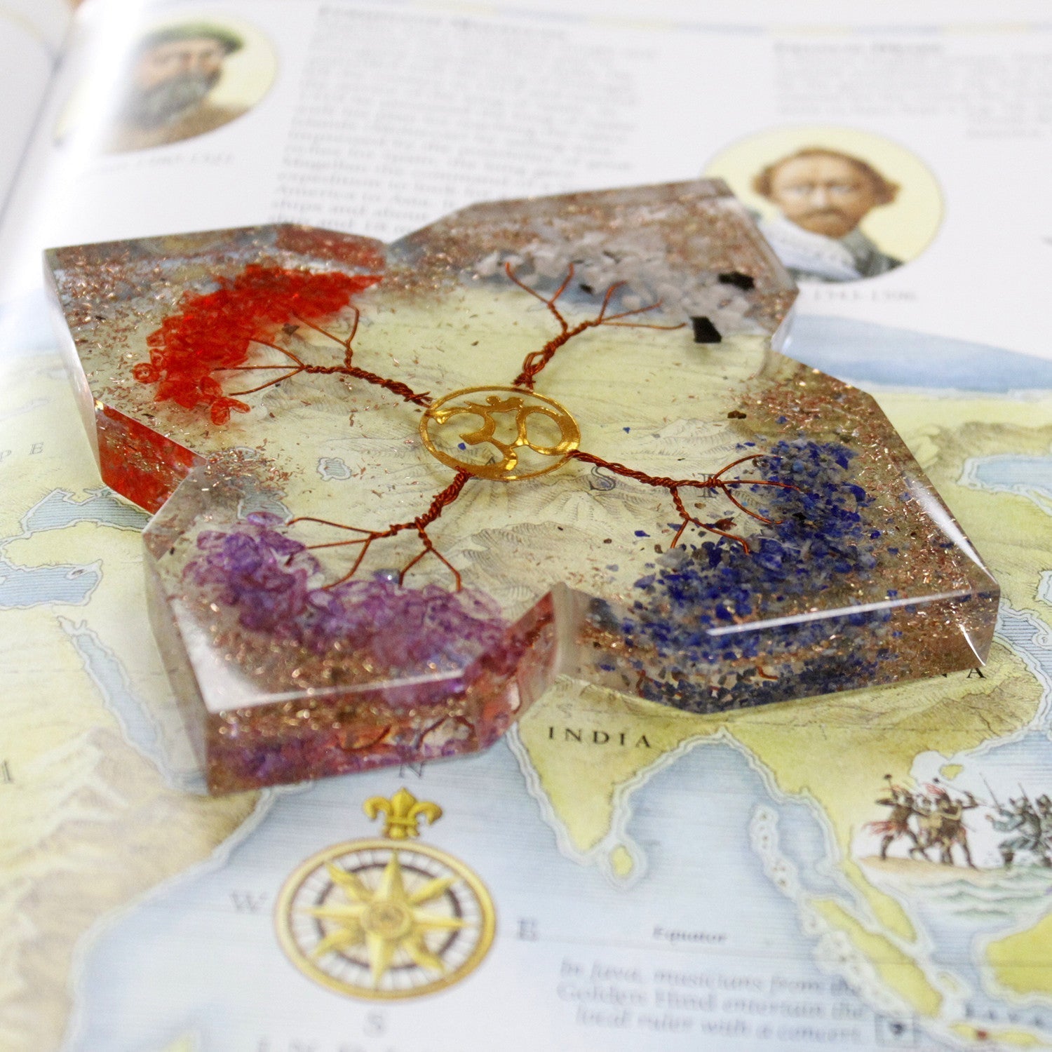✨ Răcoros la atingere, forma clară și lucioasă prinde lumina peste petele suspendate de aur și argint. În inima sa, odihnește un blând 🕉️, în timp ce linii fine de cupru se ramifică spre mici grupuri de cristale în nuanțe de chihlimbar, alb transparent, violet intens și albastru liniștit. Creat ca un simbol al armoniei, această piesă în formă de dom este modelată să radieze echilibru și o prezență liniștitoare și ancorantă.