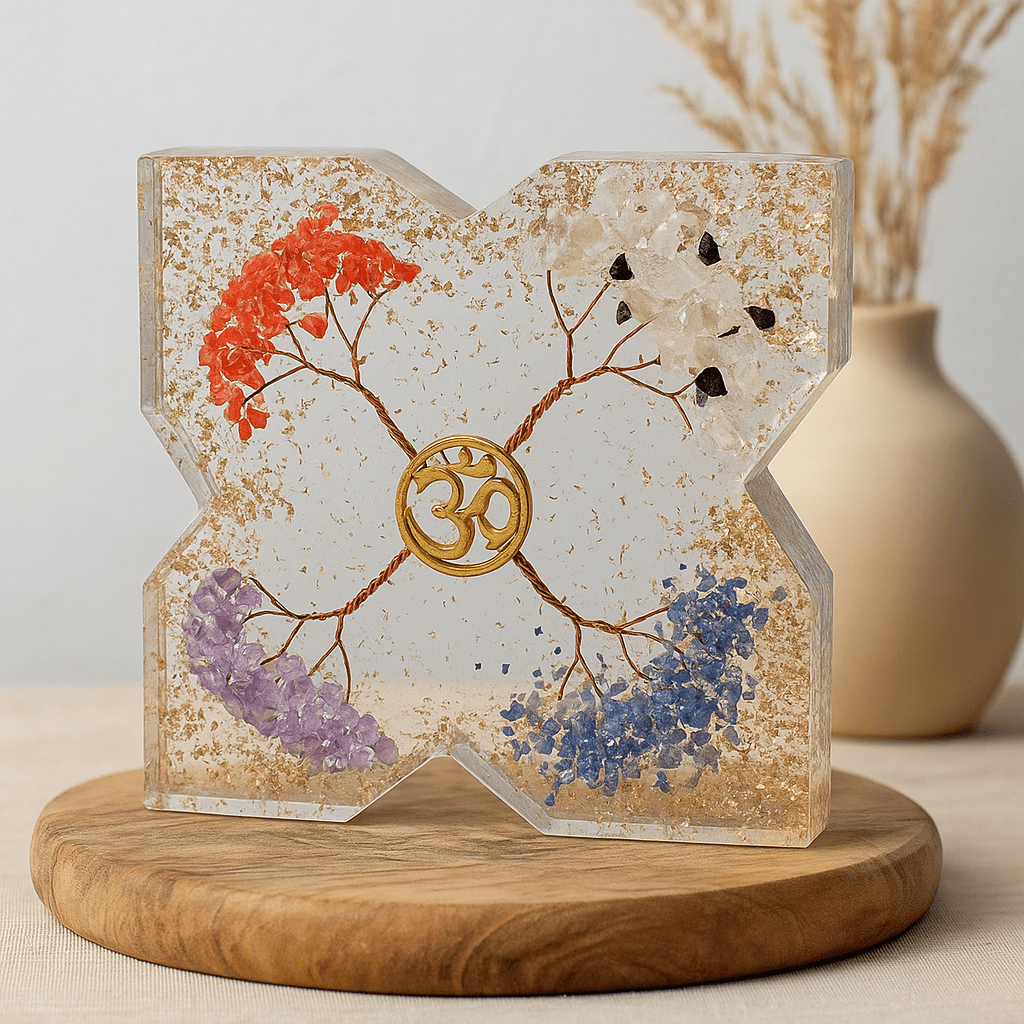 Orgone este o filozofie modernă și conștientă care vorbește despre armonizarea energiilor subtile din spațiile noastre de locuit. În acest dom, rășina stratificată, metalul și cristalele sunt aduse împreună cu o intenție simbolică: rășina ținând spațiul, metalele ghidând fluxul, cristalele oferind un punct focal natural. Profilul rotunjit și adăpostitor sugerează protecție și stabilitate—un companion ușor pentru colțurile de meditație, birouri sau un loc liniștit acasă. În multe tradiții indiene, Om (ॐ) simbolizează sunetul universal, unitatea și prezența atentă; plasat în centru, servește ca un simplu memento de a reveni la respirație. 🌿