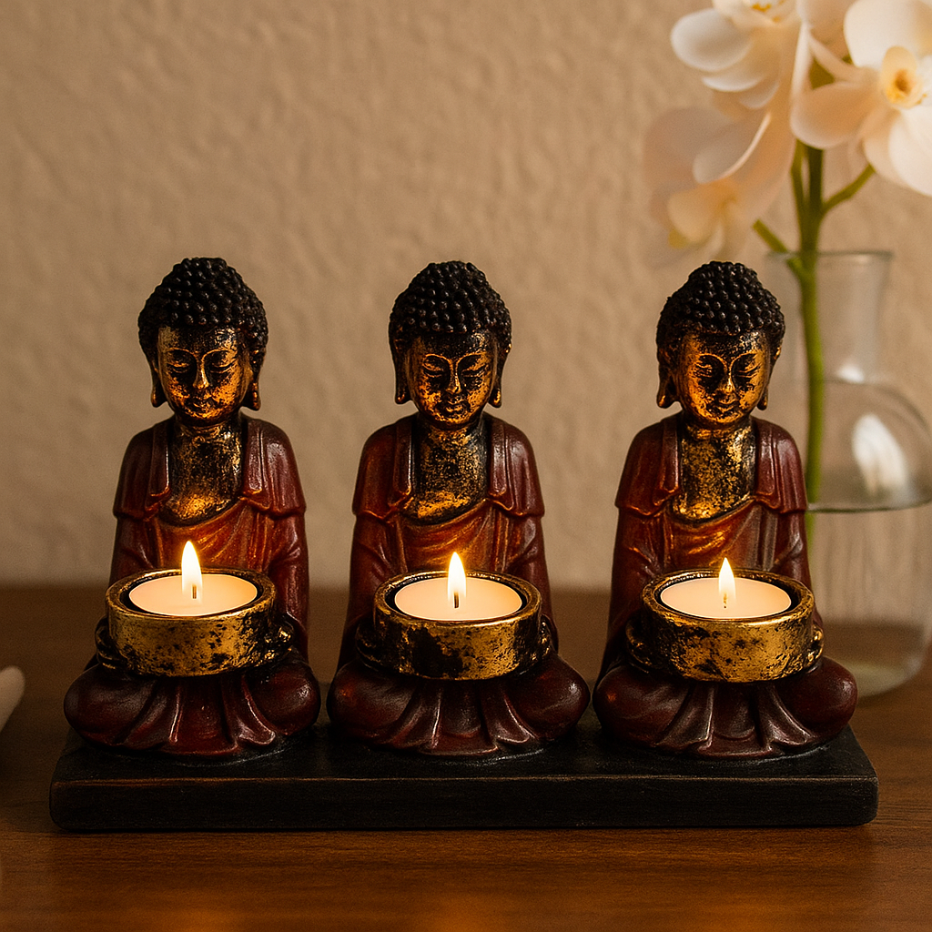 Три сидящих преданных отдыхают в спокойной симметрии на прямоугольной матово-черной основе. Текстурированные завитые волосы, мягко очерченные черты лица и драпированные мантии глубокого, выцветшего красного создают сдержанный силуэт. Покрашенное в антикварном стиле покрытие придает тонкую патину, с золотыми чашами, украшенными мягкими почерневшими акцентами. Каждая круглая чаша надежно удерживает чайную свечу, сочетая декор с функциональностью. Уважительный намек на буддийское религиозное искусство направляет форму без излишеств. 🌙