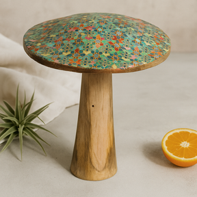 Плавный подъём дерева в широкую, слегка выпуклую крышку приносит тишину лесного спокойствия на полку или в сад. Сужающееся основание-пьедестал уверенно лежит в руке; мягко неровный край крышки и тёплая, светло-коричневая текстура придают ей приземлённое, естественное присутствие. На вершине дерева — яркий средиземноморский плиточный мотив — крошечные мозаичные формы в бирюзовом, коралловом, шафрановом, синем и белом цветах — добавляют радостный цвет к спокойной форме. 🍄