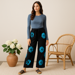 На глубоком черном фоне по ткани распускаются крупные бирюзово-голубые круглые мотивы, каждый из которых немного отличается от другого. Вдохновленные сибори — древней японской традицией окрашивания с ручной завязкой, известной своими уникальными узорами и неповторимым характером, эти брюки изготовлены вручную в Индонезии с заботой и уважением к ремеслу. Результат выглядит спокойно, графично и тихо выразительно. 🌀