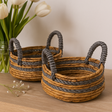 Сплетённый из натуральных банановых листьев с мягкими серыми акцентами из рафии, этот набор корзин с открытым верхом приносит тихую текстуру и тёплые землистые тона в повседневный порядок. Круглые и низкие с двумя прочными, скрученными боковыми ручками, каждая корзина ощущается устойчивой и легко доступной. Ручная работа из Индонезии, плетение демонстрирует мягкий, тактильный ритм. 🌾