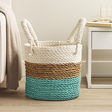 Текстурированная, ручная плетёная морская трава придаёт этой корзине для хранения устойчивое, естественное присутствие. Цветовые полосы в белом, натуральном бежевом и мягком аквамариновом добавляют тихое сияние, так что она одновременно упорядочивает и украшает пространство.