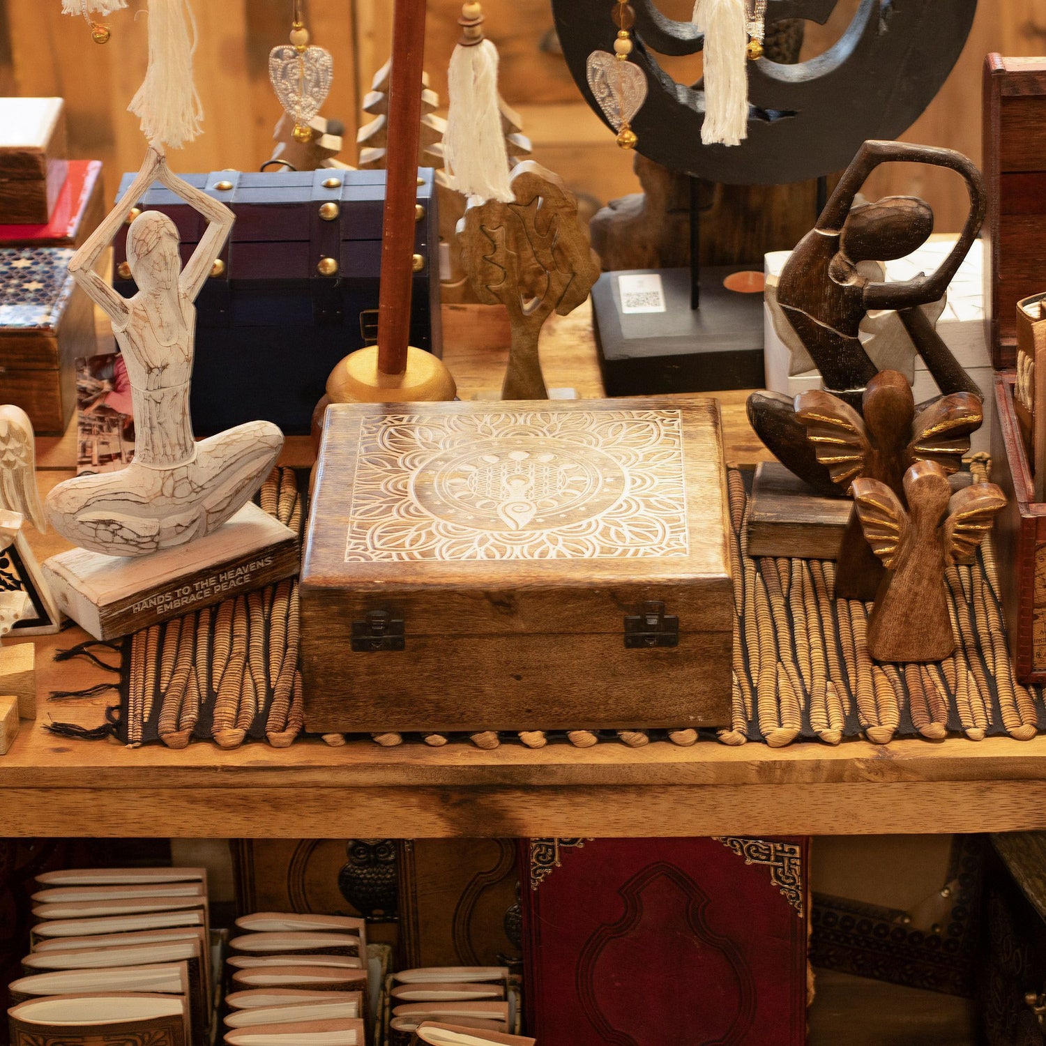 Эта очень большая шкатулка из мангового дерева — выразительный предмет для хранения, который воспевает небесную энергию и божественную женственность. Ручной работы из мангового дерева, крышка украшена детальной гравировкой Богини Луны в центре цветочного мандала, окружённой фазами луны. Она предлагает продуманное, заземляющее присутствие для хранения памятных вещей или для демонстрации в качестве значимого декоративного предмета.