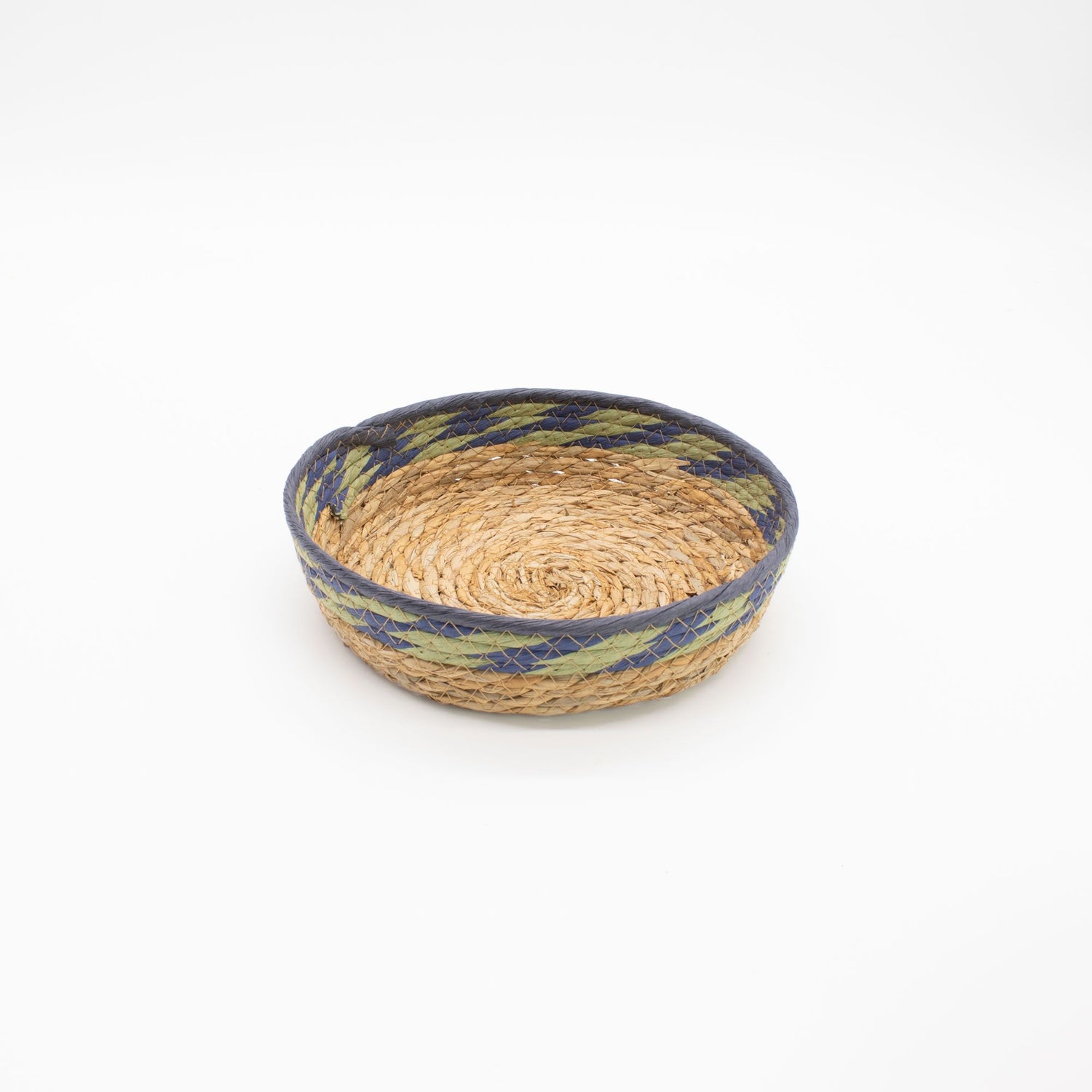 Основа каждого подноса выполнена из плотно свернутой соломы, обмотанной волокнами морской травы — техника, создающая прочные, структурированные стенки с видимым спиральным узором на поверхности. Натуральные волокна немного различаются по оттенку от изделия к изделию — от бледно-золотистого до тёплого коричневатого, в зависимости от партии. Цветная отделка — хлопковая нить, вплетённая в край в полосах мягкого зелёного и синего. Поскольку каждый поднос сделан вручную, возможны небольшие различия в интенсивности цвета, расстоянии между витками и общей форме — это признаки ручной работы, а не дефекты.